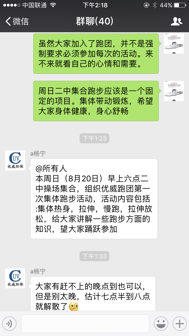 2017年8月,為促進公司職員身體健康加強內(nèi)部人員團隊活動能力,優(yōu)威公司協(xié)同業(yè)務部長跑健將楊寧組建成立了優(yōu)威奔跑團。下為團微信群,優(yōu)威奔跑團希望更多愛好跑步的朋友加入,共同團隊帶領促進健身意識。